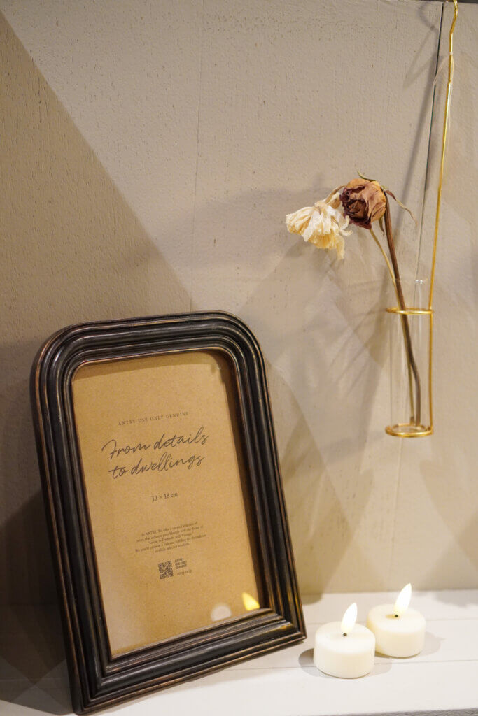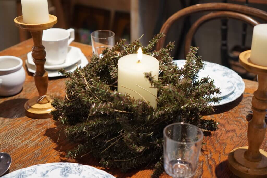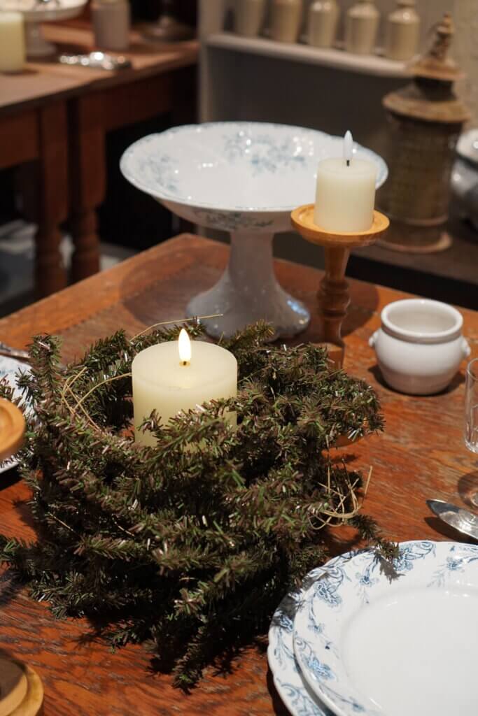 枝を軽く曲げるだけで表情が変わるので、飾るたびに違う楽しみ方ができます。当店ではキャンドルを囲むようにアレンジしてみました・:*+